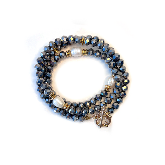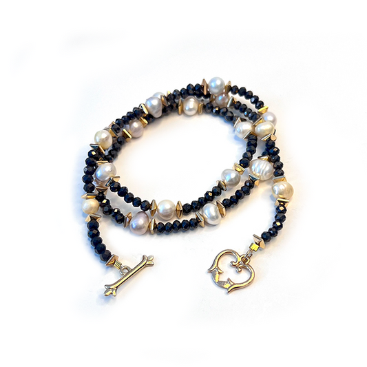 Grounded Journey- Hematite and 3 Pearls Wrap Bracelet with Heart Toggle Clasp - Necklace Option