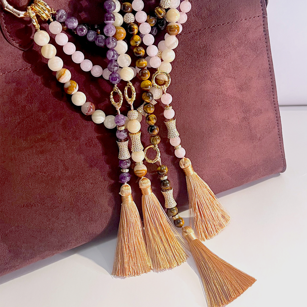 Handcrafted with smooth gemstone beads, adorned with luxurious 18K gold-plated and CZ diamond pavé hardware, and finished with a thick silk tassel, it’s more than just a meditation tool. With its versatile ring, wear it as a necklace, wrap it as a bracelet, or style it as a bag charm or wristlet. A reflection of mindfulness in motion, this piece is a beautiful reminder to stay present, wherever life takes you.